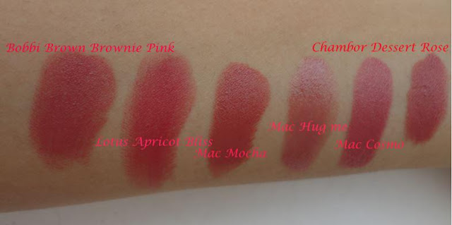 Left to right:- Chambor Powder matte in Dessert rose (Review HERE), Mac Cosmo (Review HERE), Mac Hug me (Review HERE), Mac Mocha (Review HERE), Lotus Herbals Apricot Bliss (Review HERE), Bobbi Brown Brownie Pink